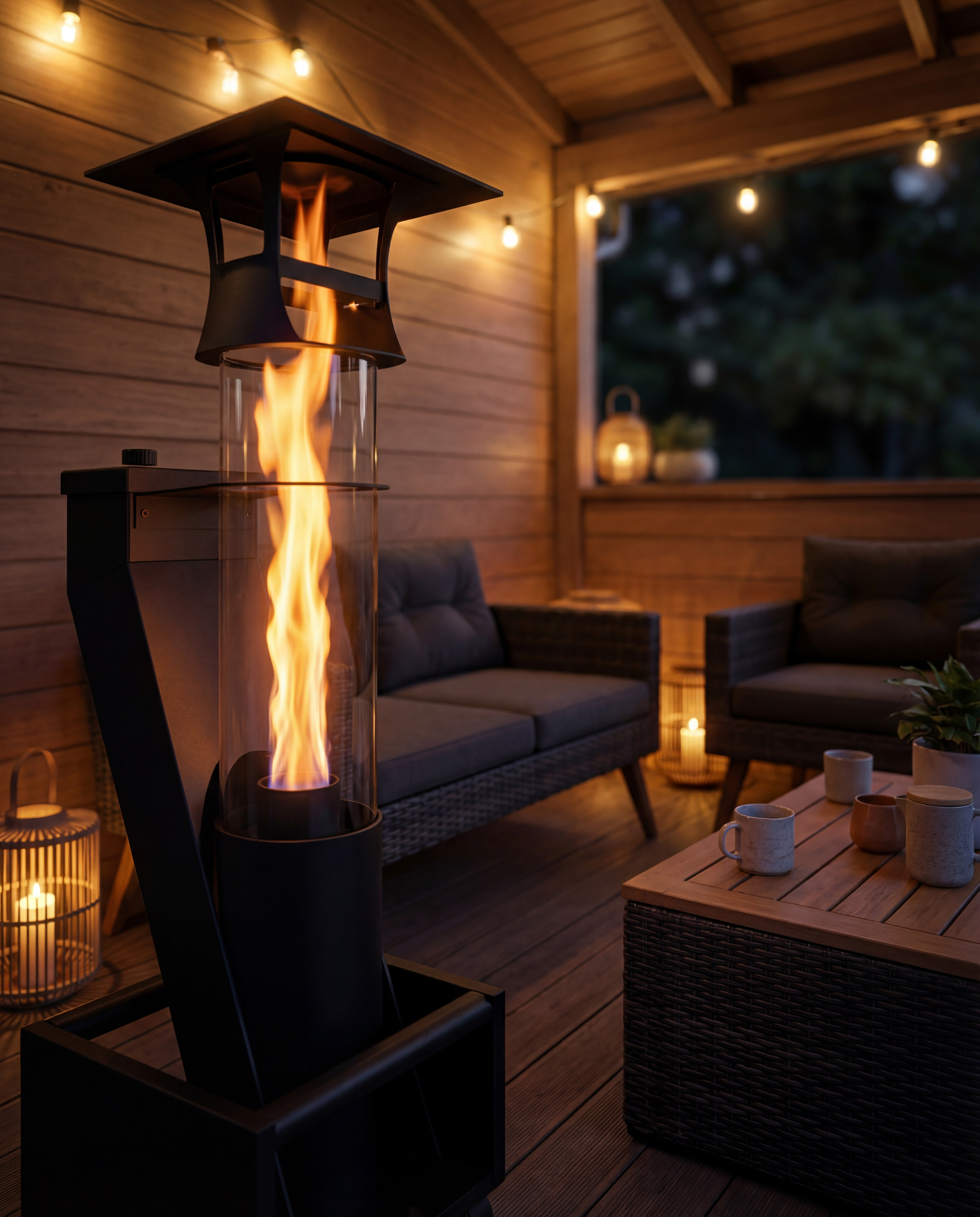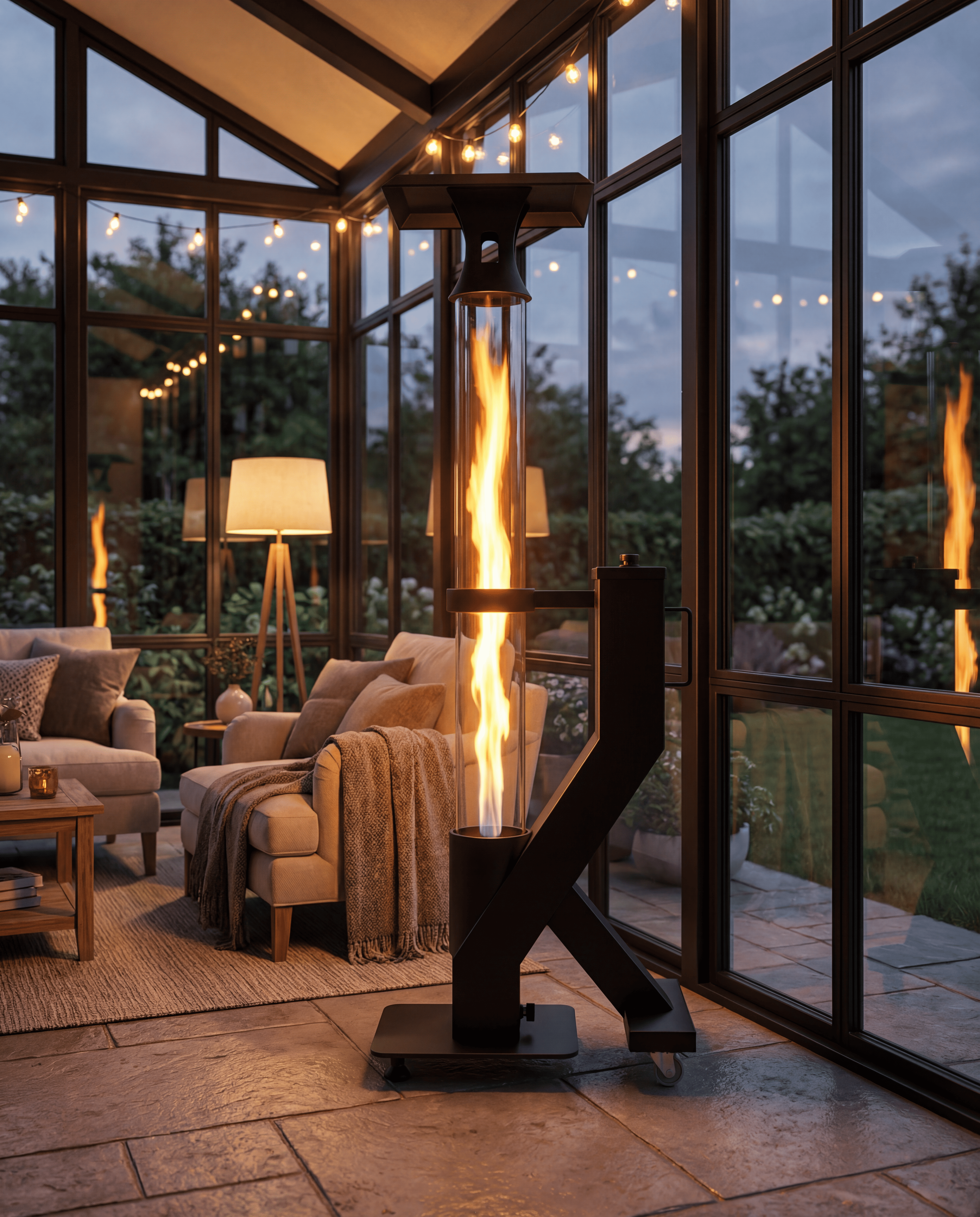 FireRocket Pro Pelletkachel: geschikt voor gebruik in goed geventileerde, overdekte ruimtes zoals een serre, terrasoverkapping of balkon van minimaal 30 m², mits er voldoende ventilatie is (bijv. een raam open).