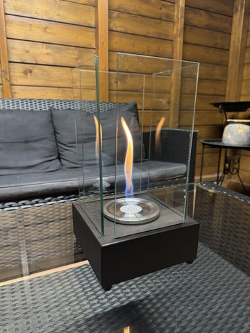 FireRocket Mini Tafelhaard: de Mini bestaat uit een stevige basis waarin u het bio-ethanol branderbakje eenvoudig plaatst. Vervolgens schuift u de vier losse glazen panelen in de openingen aan de zijkanten. Vul het branderbakje met bio-ethanol, steek het aan en geniet van de sfeervolle vlammen op tafel.