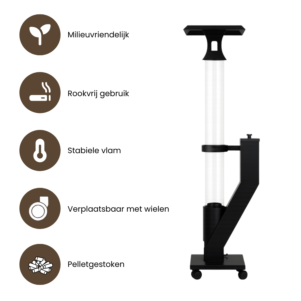 - Gebruiksvriendelijk – geen stroom of gas nodig, enkel houtpellets en een aansteker.