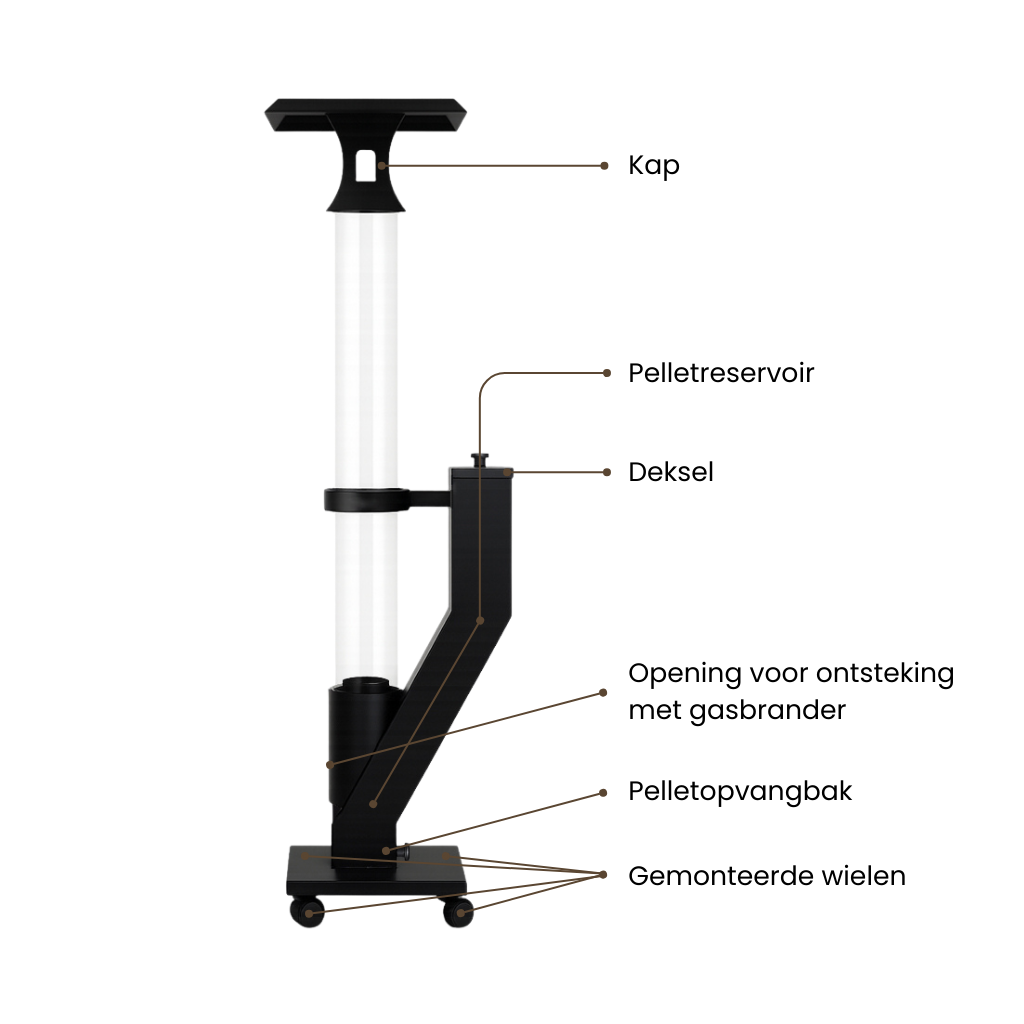 Let op: houtpellets en een gasbrander worden niet meegeleverd. Deze dienen apart te worden aangeschaft.